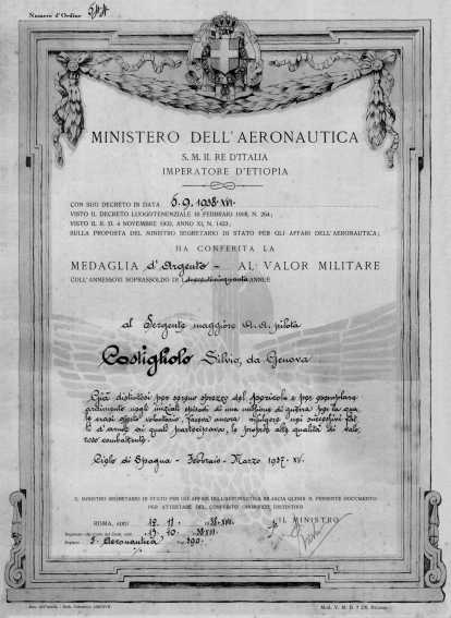 Roma - 1938 Motivazione della Medaglia d’Argento al Valor Militare: "Volontario di una missione di guerra combattuta per un supremo ideale, affrontava ardimentosamente le piú ardue prove, dando costante esempio di sereno sprezzo del pericolo e di alto valore". Firmato: Generale Francesco Pricolo |