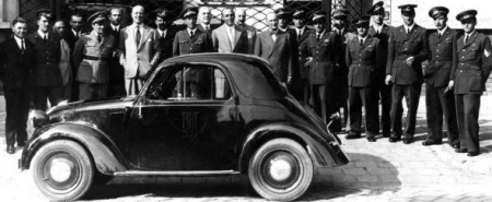 | mon02a: Budapest - 14 Giugno 1936. Giornata dell'Ala. I piloti della Squadriglia Acrobatica con le autorita' Ungheresi e funzionari del Consolato Italiano davanti alla Sede locale della FIAT. Da sinistra: Dipendente del Ministero Ungherese incaricato dell'assistenza ai piloti italiani, serg. Renzi, m.llo spec. Bianchi, civile ungherese, ufficiale ungherese, due funzionari Consolato Italiano, serg. Romandini, maggiore dell'A.M.I. Addetto Militare, quattro funzionari Consolato, serg. Monico (seminascosto), cap. Viola, cap. Rossi, ufficiale dell'Esercito Ungherese, s.ten. Pezze', serg. Chianese, serg. Corsi, serg. Montanari, serg. Carini. In primo piano la Fiat 500A. |