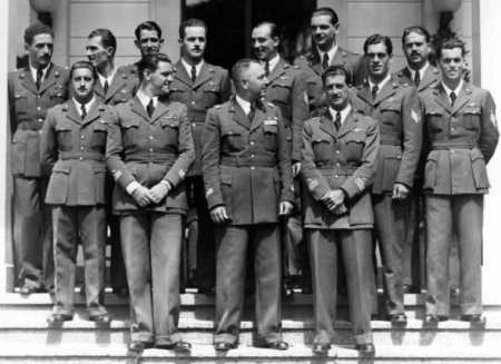 | mon03: Gorizia - 27/09/1935. Il duca Amedeo d'AOSTA con i piloti del IX Gruppo Caccia Terrestre davanti ad un C.R. 32 Da sinistra, in piedi: serg. SOZZI (1°), serg. BREVEGLIERI (2°), serg.LARESE (3°), s.ten. GALBIER (4°), ten. ZUFFI (5°), cap. MOSCATELLI (6°), ten. VIOLA (7°), magg. CHIESA (8°), Amedeo duca d'AOSTA (9°), col. BONOLA (10°), magg. MOORE (11°), cap. MOLINARI (12°), ten. D'AGOSTINIS (13°), serg. MONTANARI (14°), serg. SARTORI (15°), ten. LARCHER (16°). Da sinistra, seduti: serg. ALBANI (1°), serg. ... (2°), cap. PIRAGINO (3°), serg. DE PARI (4°), serg. COLOMBINA (5°), s.ten. ... (6°), ten. NERI (7°), ten. SAMA (8°), serg. COSTIGLIOLO (9°), serg. REDAELLI (10°), serg. AVVICO (11°), serg. ... (12°), ten. LARSIMONT (13°), serg. ... (14°), ten. DAGASSO (15°), serg. ... (16°) Sullo sfondo un C.R. 32. |