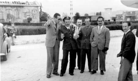 | Aeroporto di Gorizia, anni '50. Personale dello Scalo e ... amici, sul piazzale che in precedenza costituiva la pavimentazione dell'hangar Lancini-Nord (Castelletti08) |