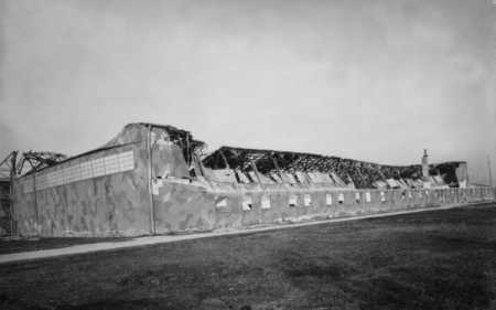 | Ronchi dei Legionari - 1944, uno dei due hangar dell'aeroporto dopo il bombardamento degli Alleati. |